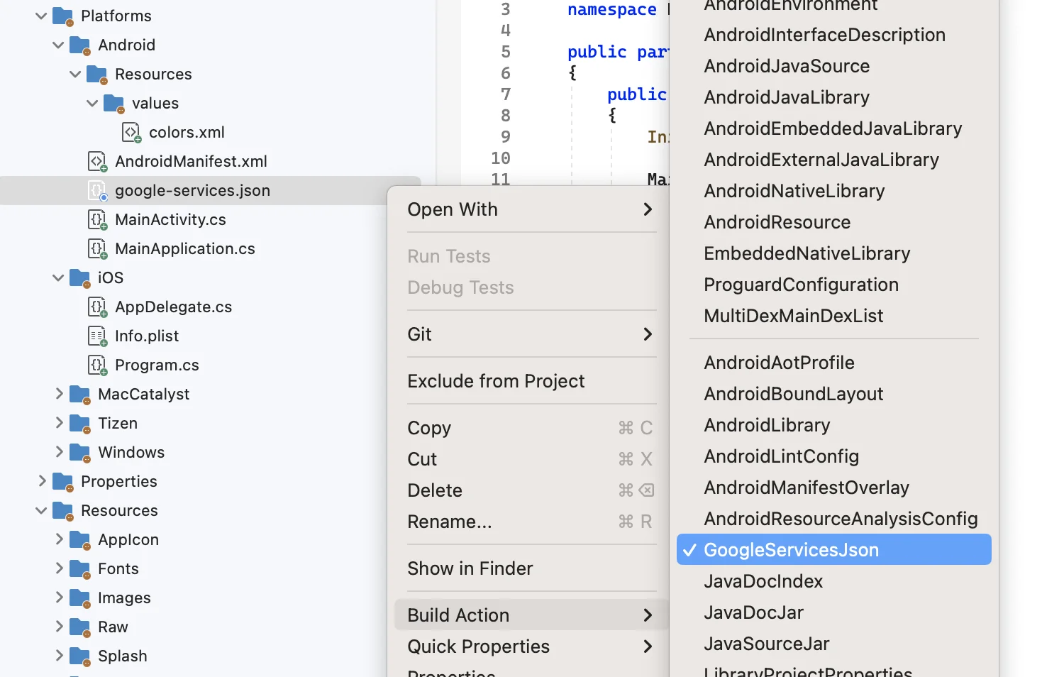 4. 将 google-services.json 添加到您的 Android 平台目录的根目录。为此文件设置 GoogleServicesJson 构建操作: