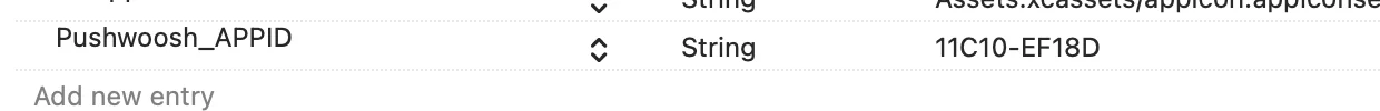 [Export("application:didFailToRegisterForRemoteNotificationsWithError:")] public void FailedToRegisterForRemoteNotifications(UIKit.UIApplication application, NSError error) { PushManager.Instance.FailedToRegisterForRemoteNotifications(error); }10. 在 Info.plist 中,将 Pushwoosh_APPID 值更改为您的 Pushwoosh Application Code。您可以在您的 Control Panel 中找到它:\