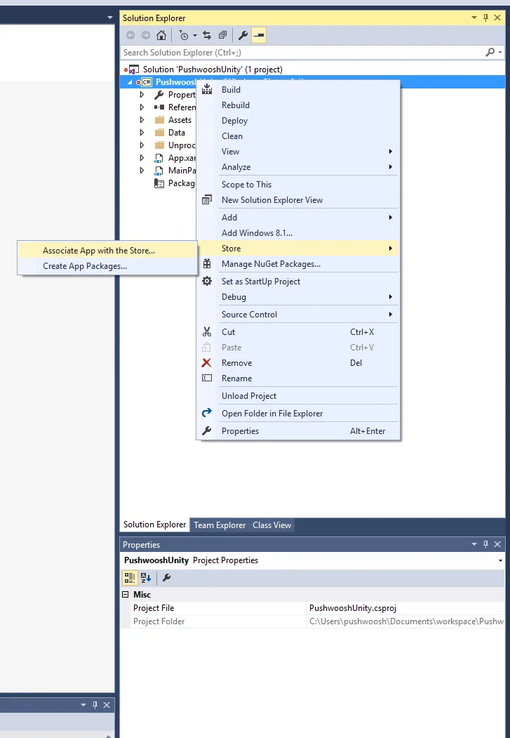 <linker> <assembly fullname="PushSDK" preserve="all"/></linker>- 您还需要在导出的 Visual Studio 项目中将应用与商店关联。请确保您的应用使用与您的发布者身份匹配的证书进行签名。