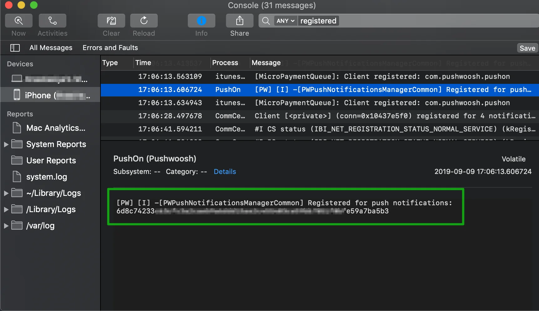启动您需要设备推送令牌的应用程序,并在“Registered for push notifications”行中找到您的 64 个十六进制字符的设备推送令牌: